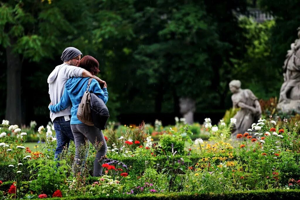 这张照片是法兰克福一个宫殿的后花园,我在拍摄的时候突然遇到下雨了。于是就在一棵树下躲雨。看到花园里人渐渐少了,反而显得宁谧。于是我选择了这样一个背景——树丛暗可以突出主体,地面的花层层叠叠很好看,右边还有雕塑做个画面的平衡点。那么只要有人从左往右走,当他们走到画面左边的时候我就拍摄。等了一会这对情侣走来,这才是我想要的主体。