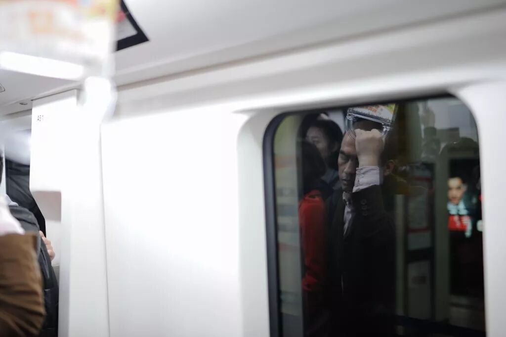 有人的地方总会找到玻璃,玻璃的反光里面经常有很值得拍摄的瞬间。比如这张地铁里的玻璃反光,我们能看到一个疲惫的男人。照片要表达的内容不言而喻。