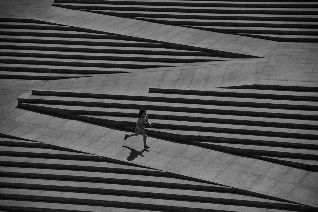 广场和台阶是你要关注的另一个好场景。我常说大太阳天不要拍照,而有台阶的广场可能是为数不多的可以大太阳天拍摄的场景了。因为会有独特的光影效果。一定要空旷一些,一定要有个人。如果人在阴影中怎么办?没关系,剪影都可以。
