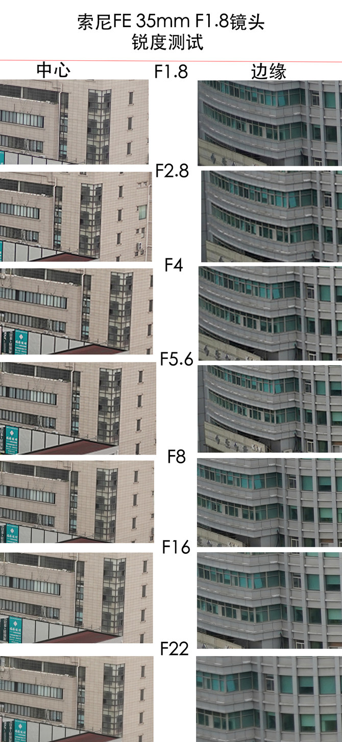 由以上样图,索尼FE 35mm F1.8镜头在最大光圈F1.8之下,中心与边缘位置基本保持较为不错的锐度及清晰度,F2.8开始可以明显感受到锐度的变化进一步提升,而在F2.8-F16范围内中心和边缘的锐度基本稳定可以保持一致,从F16开始锐度开始明显下降,F22则效果更为明显。总的来说,索尼FE 35mm F1.8镜头的边缘和中心画质的锐度都表现不错,最大光圈下可用,非常好的光圈出现在F8,画面清晰,到F16的光圈范围为止都可放心使用。