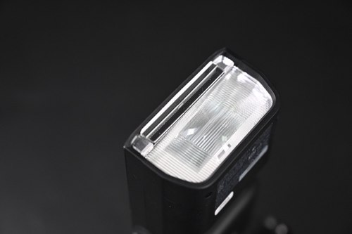 虽然闪光灯的外形设计紧凑,但依旧提供最大120度的灯头折叠调度。操作时按住右侧“push”按钮即可翻转至相应角度,实现不同的光线折射角度。此外,灯头区域的眼神光板和宽版依旧采用隐藏设计,抽出即可使用。