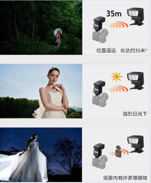 索尼HVL-F28RM 智能闪光灯具备最多15个闪光灯的无线引闪功能,从而实现复杂的光线环境设置,满足多种苛刻环境下对光线营造的需求。