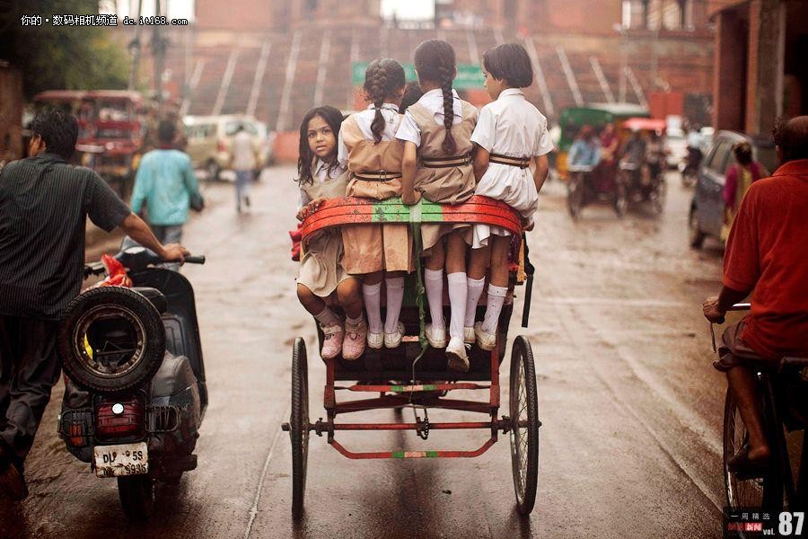 当地时间8月5日,印度新德里街头即景,女学生们乘坐一辆人力车上学。AP Photo/Kevin Frayer