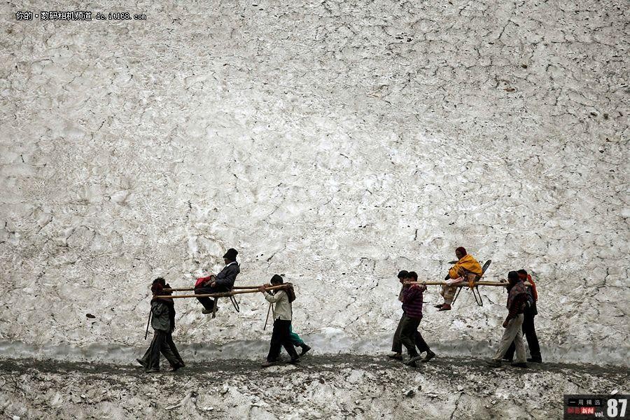 当地时间7月31日,两名前往克什米尔阿玛纳特山朝圣的教徒被抬在轿子上,他们正在经过海拔4115米的冰川地区。AP Photo/Altaf Qadri