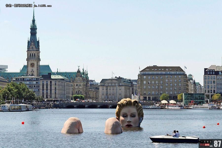 当地时间8月3日,德国汉堡,两名划船的男子正观看一座高达4米的“美人鱼”巨型雕像。AP Photo/dapd, Axel Heimken