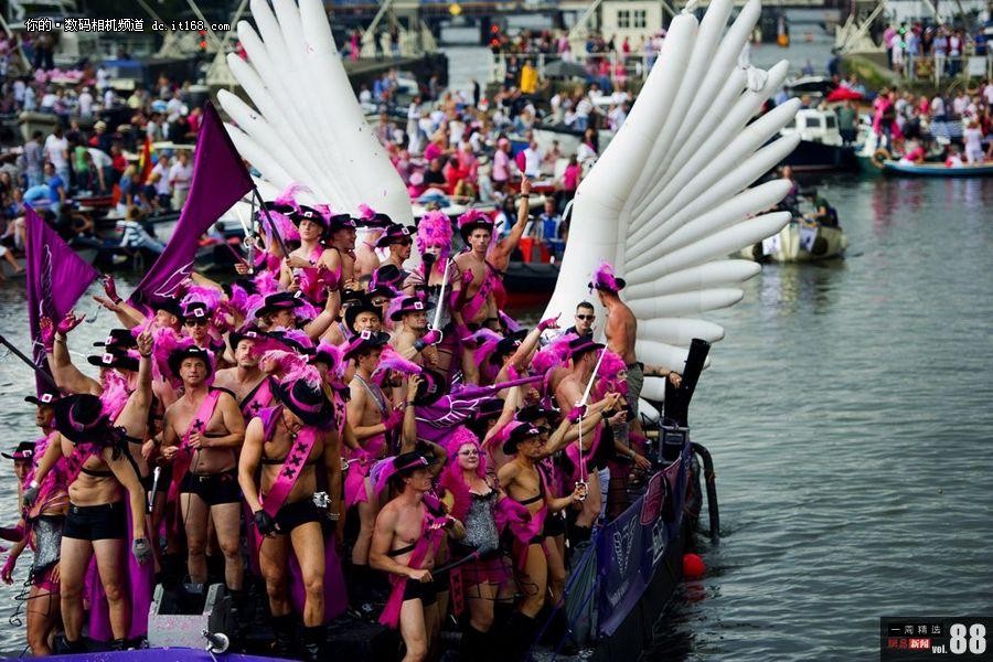 8月6日,荷兰阿姆斯特丹,参加一年一度的“同性恋自豪”水上游行的人们。今年游行的主题是“我们同在”,共有80只游行船在阿姆斯特丹运河上航行。