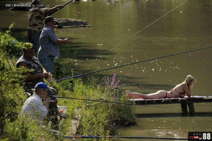 8月7日,俄罗斯索契,比基尼女郎在晒太阳,几名男子在其身后垂钓。