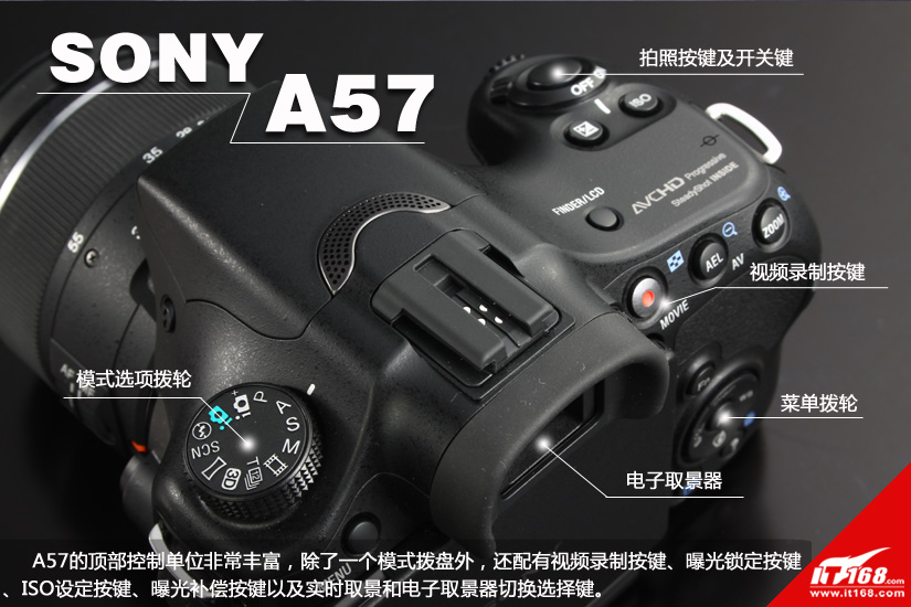 A57的顶部控制单位非常丰富,除了一个模式拨盘外,还配有视频录制按键、曝光锁定按键、ISO设定按键、曝光补偿按键以及实时取景和电子取景器切换选择键。