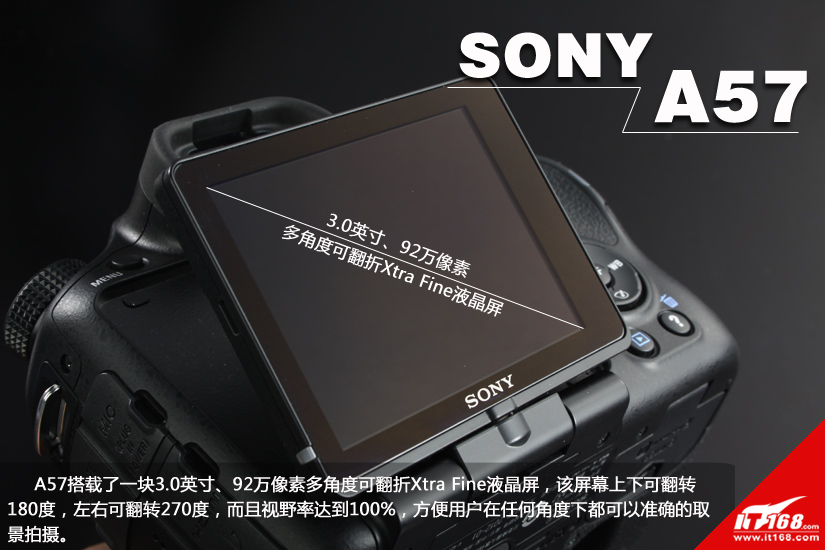 【IT168 评测】2012年3月22日,索尼发布了一款针对入门级主流用户的数码单电相机A57。A57采用了全新的1610万像素Exmor APS HD CMOS影像传感器和Bionz处理器,达到12fps连拍速度.A57还采用了电子取景器,分辨率达到144万像素,进一步提升了取景细腻度,并具备最大/标准模式切换选择,让100%视野率的取景观感更加舒服、清晰。此外,A57还新增了两种个性化功能:清晰影像缩放技术和自动肖像构图。