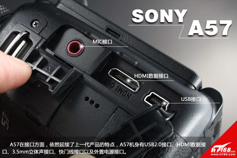 A57在接口方面,依然延续了上一代产品的特点,A57机身有USB2.0接口、HDMI数据接口、3.5mm立体声接口、快门线接口以及外置电源接口。