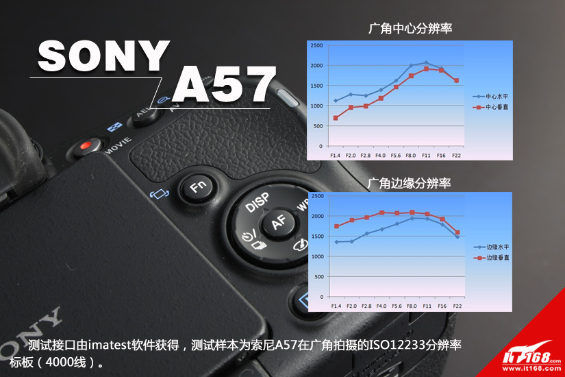 测试接口由imatest软件获得,测试样本为索尼A57在广角拍摄的ISO12233分辨率标板(4000线)。