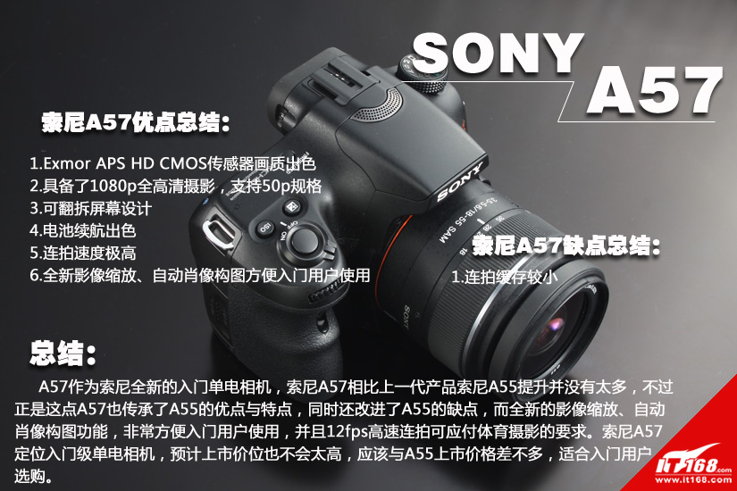 作为索尼全新的入门单电相机,索尼A57相比上一代产品索尼A55提升并没有太多,不过正是这点A57也传承了A55的优点与特点,同时还改进了A55的缺点,而全新的影像缩放、自动肖像构图功能,非常方便入门用户使用,并且12fps高速连怕可应付体育摄影的要求。索尼A57定位入门级单电相机,预计上市价位也不会太高,应该和A55上市价格差不多,适合入门用户选购。