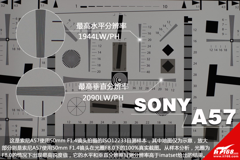 这是索尼A57使用50mm F1.4镜头拍摄的ISO12233目测样本,其中地图仅为示意,放大部分则是索尼A57使用50mm F1.4镜头在光圈F8.0下的100%真实截图。从样本分析,光圈为F8.0的情况下出现最高锐度值,它的水平和垂直分辨率目测分辨率高于imatset给出的结果。