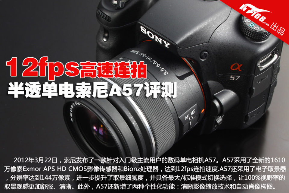 【IT168 评测】2012年3月22日,索尼发布了一款针对入门级主流用户的数码单电相机A57。A57采用了全新的1610万像素Exmor APS HD CMOS影像传感器和Bionz处理器,达到12fps连拍速度.A57还采用了电子取景器,分辨率达到144万像素,进一步提升了取景细腻度,并具备最大/标准模式切换选择,让100%视野率的取景观感更加舒服、清晰。此外,A57还新增了两种个性化功能:清晰影像缩放技术和自动肖像构图。