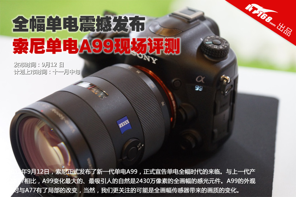 2012年9月12日,索尼正式发布了新一代单电A99,正式宣告单电全幅时代的来临。与上一代产品A77相比,A99变化最大的、最吸引人的自然是2430万像素的全画幅的感光元件。A99的外观相对与A77有了局部的改变,当然,我们更关注的可能是全画幅传感器带来的画质的变化。