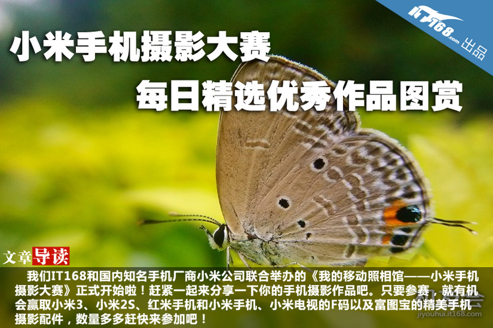 我们IT168和国内知名手机厂商小米公司联合举办的《我的移动照相馆——小米手机摄影大赛》正式开始啦!赶紧一起来分享一下你的手机摄影作品吧。只要参赛,就有机会赢取小米3、小米2S、红米手机和小米手机、小米电视的F码以及富图宝的精美手机摄影配件,数量多多赶快来参加吧!